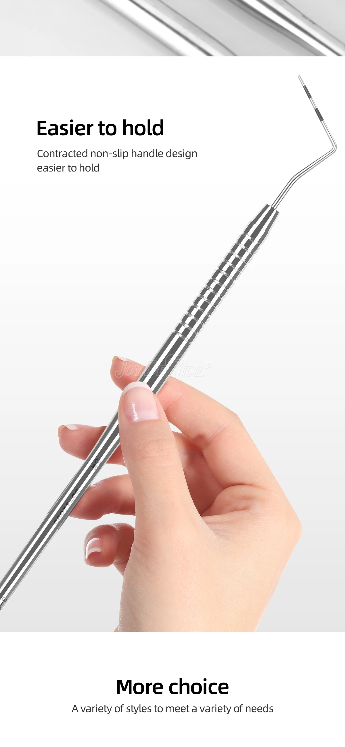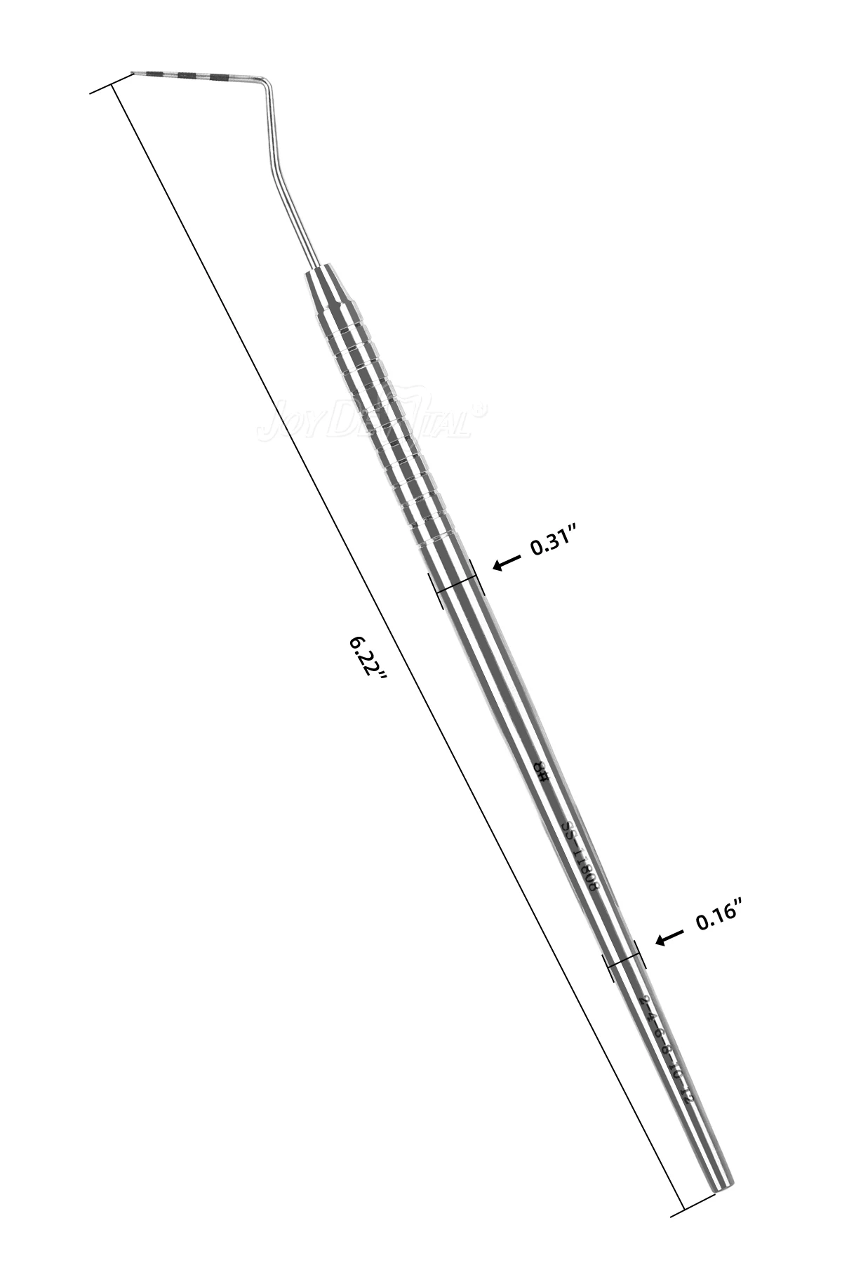 It is used to probe the lesions on the tooth surface and gingiva, etc. Touching apparatus with a thin working part at the end. The working parts are usually needle-shaped, hook-shaped, or round-headed, depending on the purpose. It’s reusable.