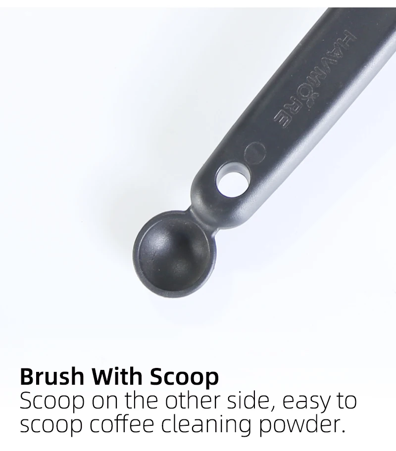 2. Professional design: The unique design and water baffle can keep hands cool and dry during backwashing. The internal short mane is soft and designed for cleaning the head. The external 360 ° brush is used to clean the espresso set head gasket. On the other side of the brush, there is a spoon that allows you to easily scoop out the cleaning powder at any time.