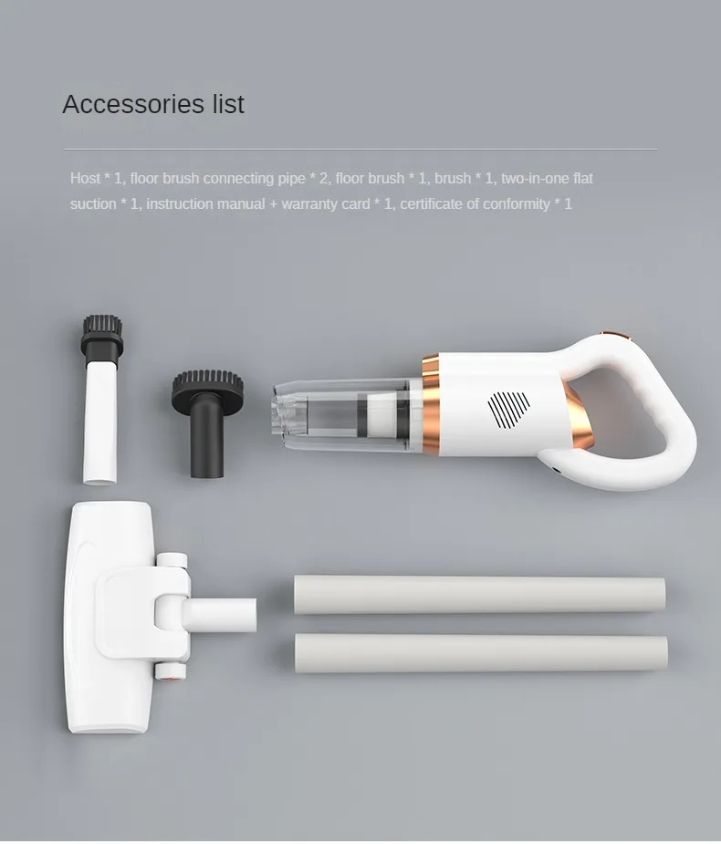 Thoughtful configuration of floor brush and 2 connecting pipe accessories: The floor brush is designed specifically for hard floors, and the connecting pipe can penetrate narrow gaps and corners to meet diverse cleaning needs.