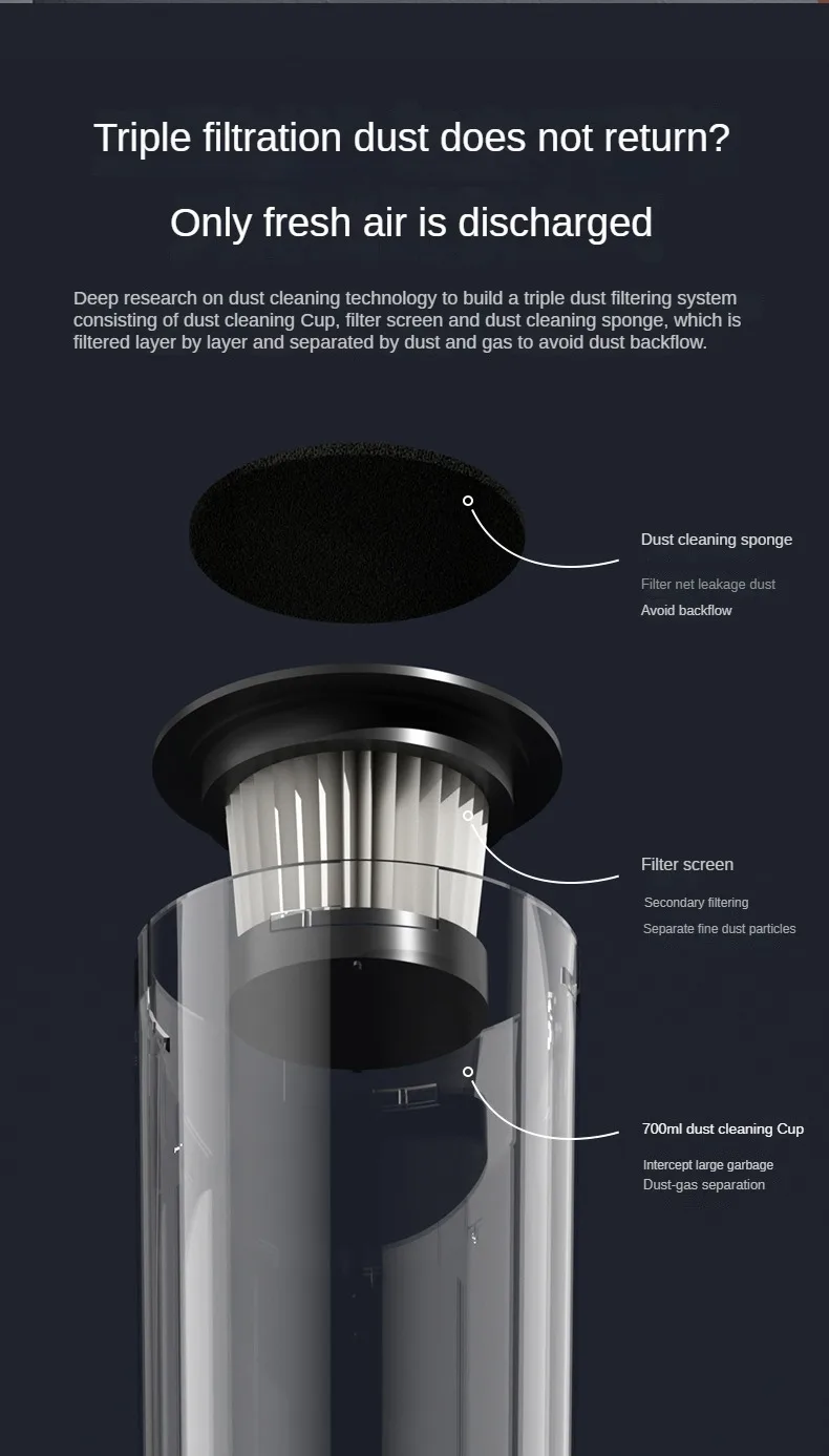 Equipped with a 700ml oversized dust collection cup design, there is no need for frequent emptying, greatly improving cleaning efficiency and allowing you to complete cleaning work in a shorter time. (There is a data contradiction in the original text, with 500ml written in the previous text and 700ml written in the following text. The translation should be based on the 700ml in the following text.)