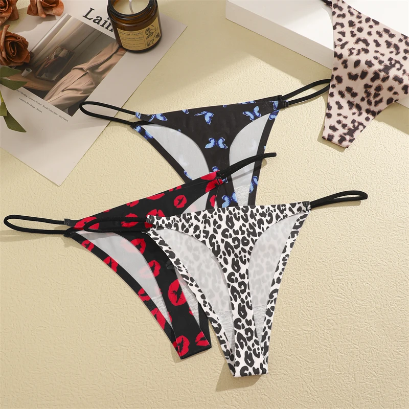 FINETOO 3Pcs Seamless Silk G String Leopard Women Panties Flower Bikini Sexy Thongs Female Comfortable Low-waist Lingerie XS-XL