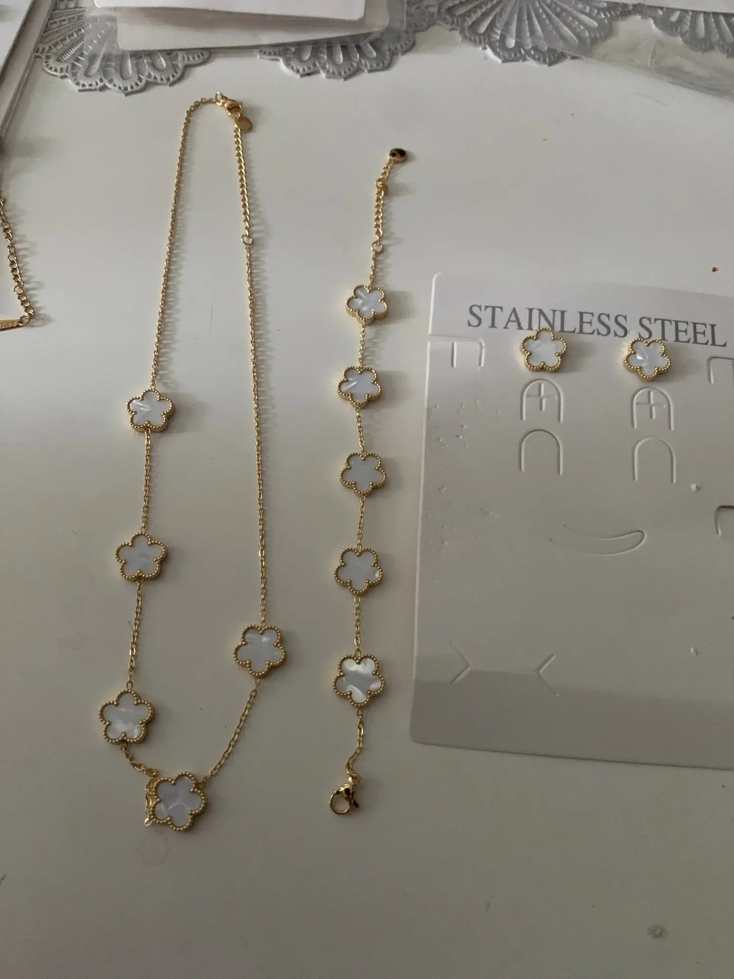 Be the first to review “LUXUKISSKIDS Fashion Flower Necklace Earrings Set Jewelry Women Stainless Steel White Shell Clover Bracelet Jewelry Accessories”