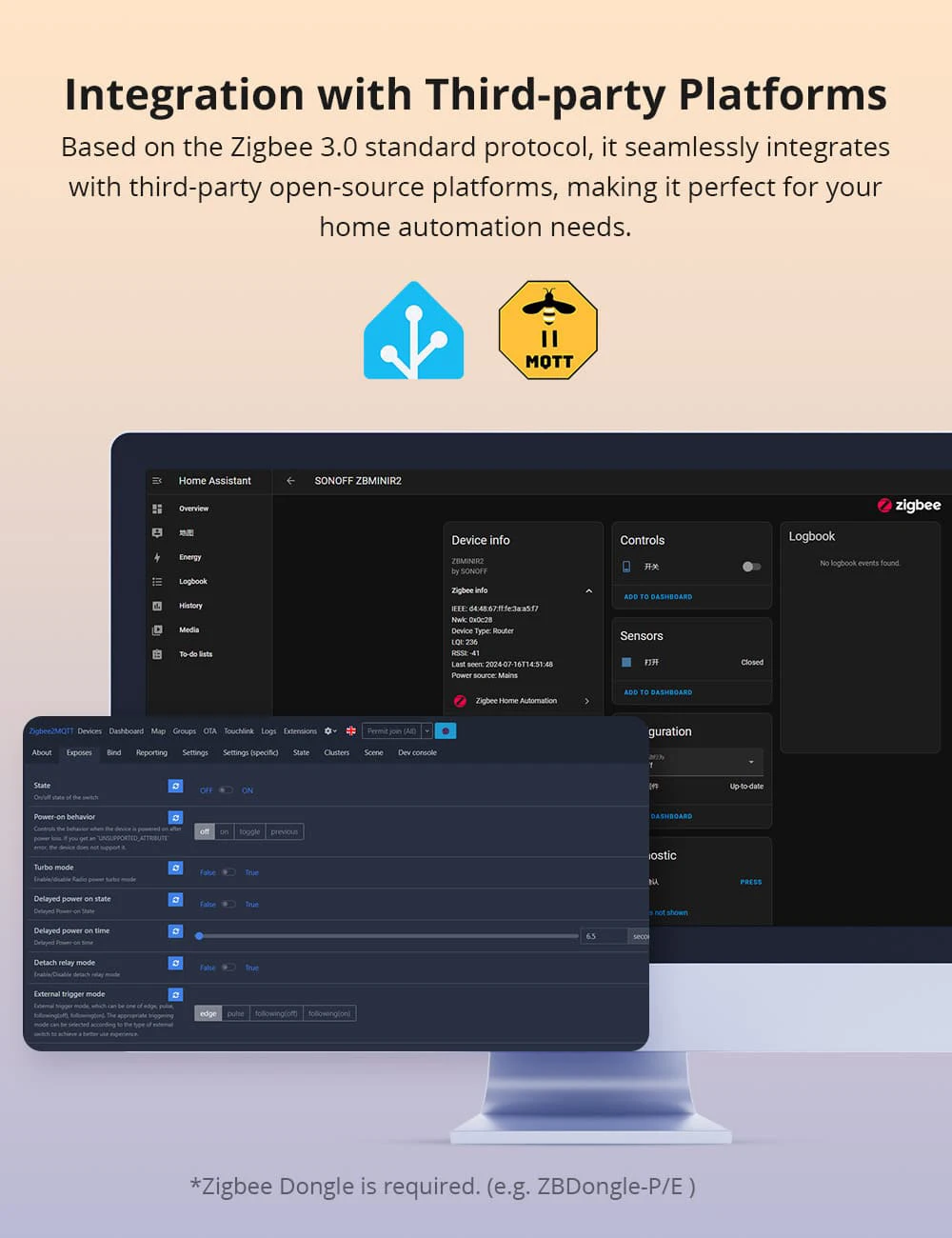 Based on the Zigbee 3.0 standard protocol, ZBMINIR2 seamlessly integrates with third-party open-source platforms, such as Home Assistant, Zigbee2MQT( Zigbee Dongle is required, e.g. SONOFF ZBDongle-P/ ZBDongle-E) making it perfect for your home automation needs.